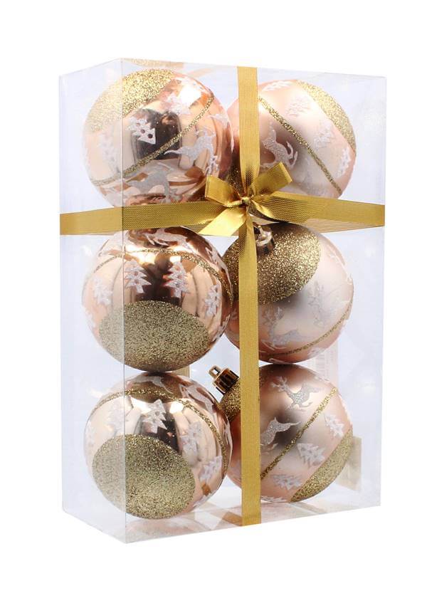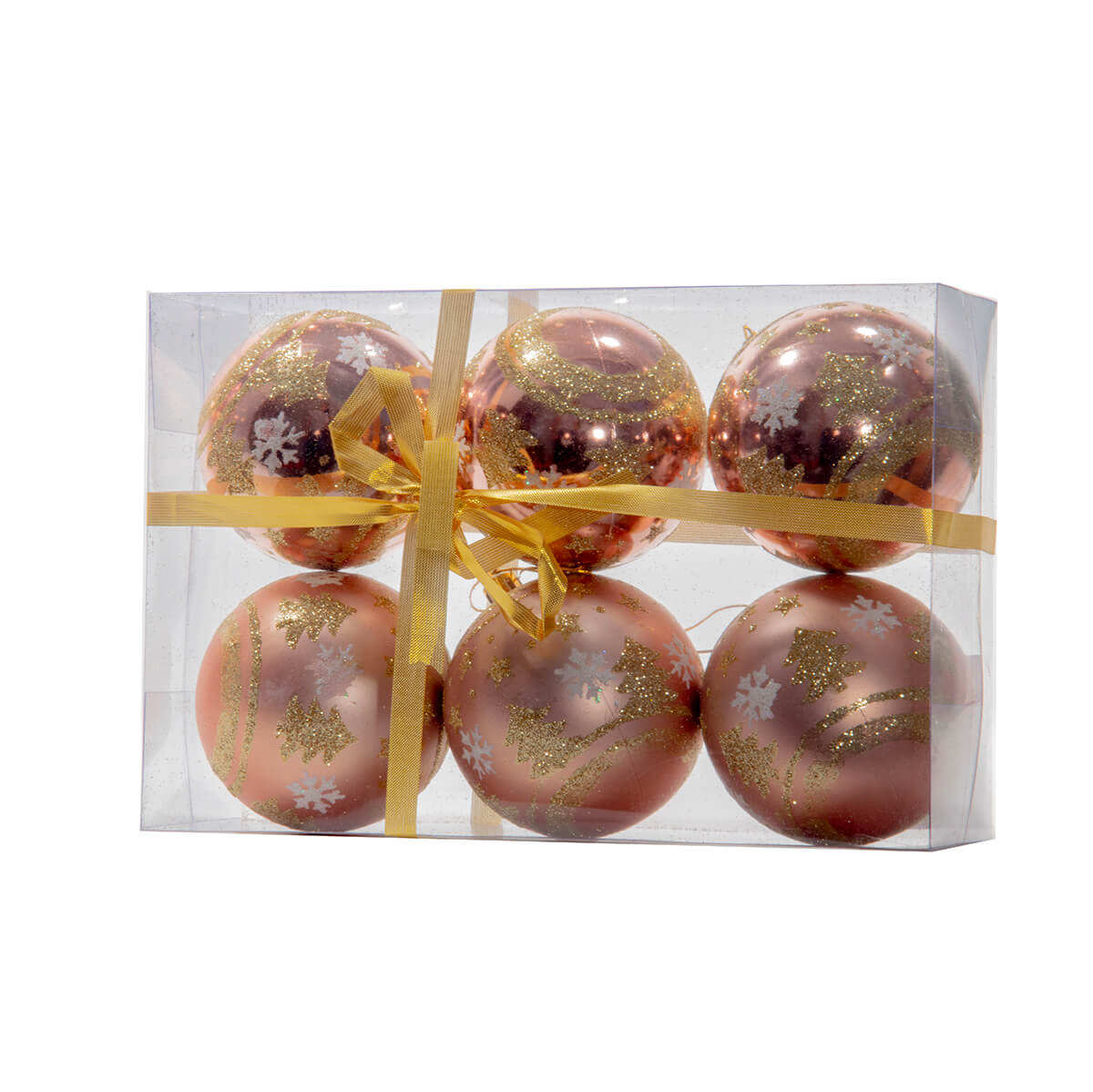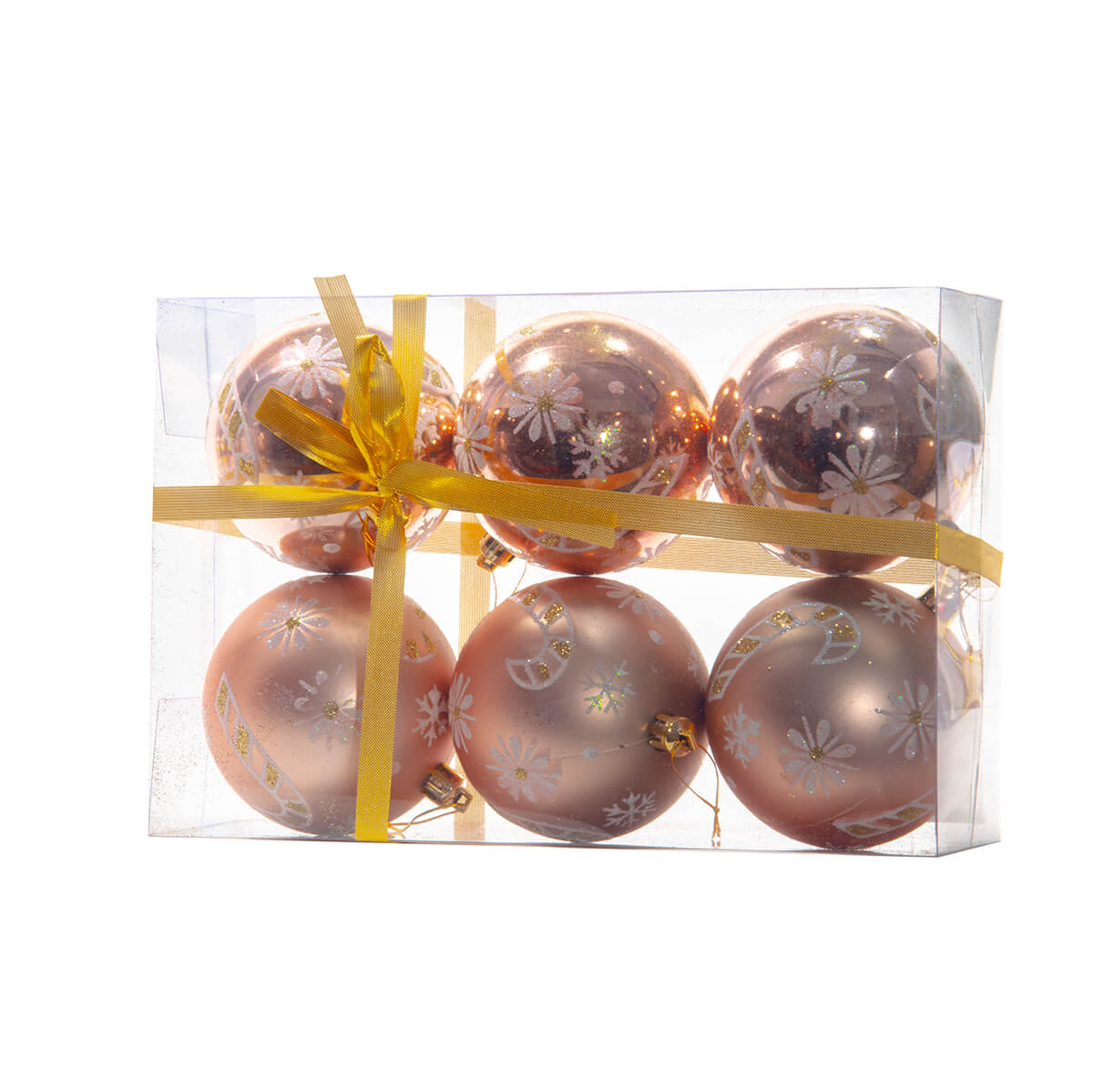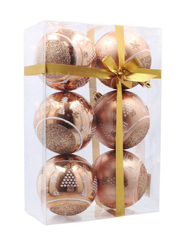 Komplet nowoczesnych, pięknych bombek. Urokliwie prezentują się na choince. W komplecie znajdują się 3 bombki matowe oraz 3 błyszczące z wzornictwem do wyboru. Bombki nadają się idealnie jako ozdoba świąteczna do powieszenia na oknie lub choince. Wykonane z tworzywa sztucznego, nietłukące się.