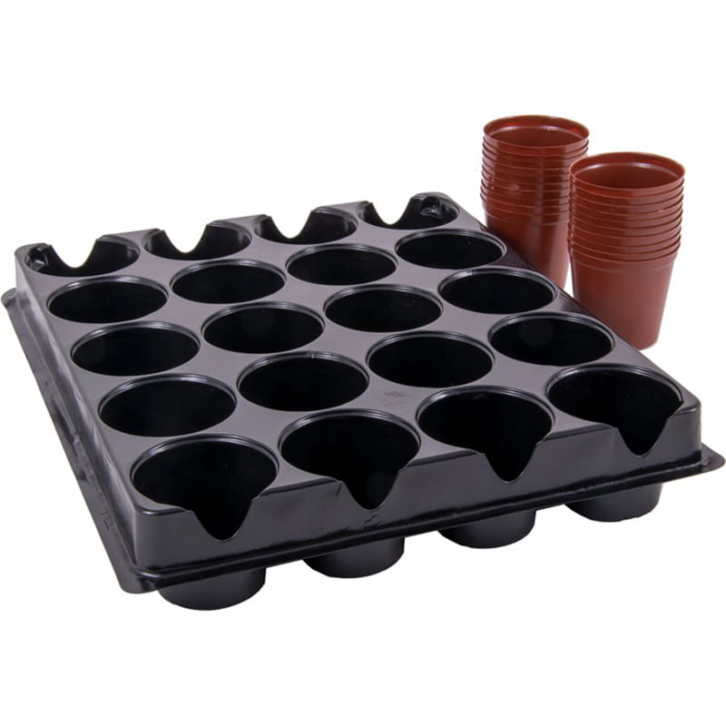 Okrągłe doniczki do planowania rozsady. Składa się on z 20 doniczek wraz z tacą wykonanych z tworzywa sztucznego. Każda doniczka posiada trzy małe otwory, umożliwiające odpływ nadmiaru wody. Tacka służy jako podstawka do doniczek oraz spływa do niej nadmiar wody z rośliny.