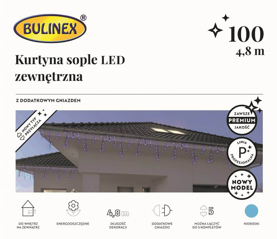 Dekoracja świetlna 100 LED do stosowana na zewnątrz pomieszczeń, z dodatkowym gniazdem końcowym, który umożliwia łączenie ze sobą pięciu kompletów tego samego typu. Jest to efektowna dekoracja balkonów, balustrad oraz dachów.