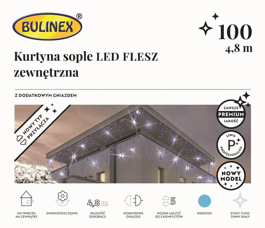 - Kurtyna FLASH - Kolor światełek: 75% niebieski, 25% zimny biały migające, czarny przewód