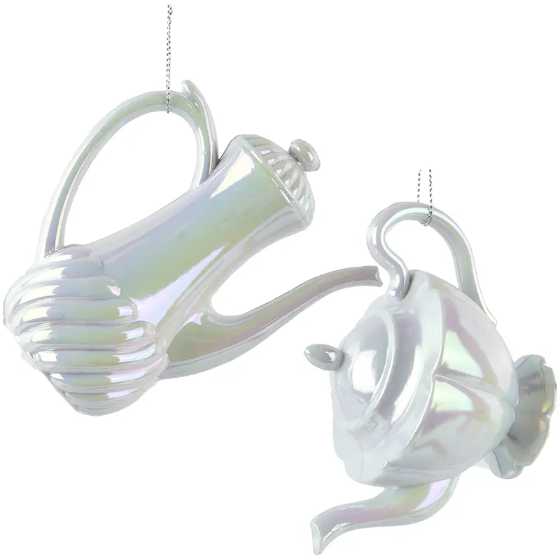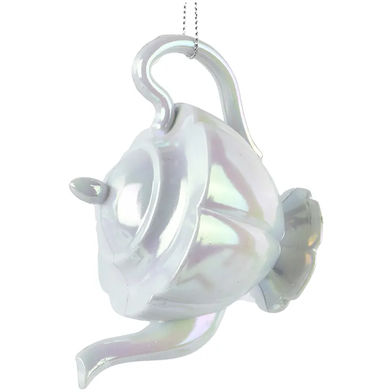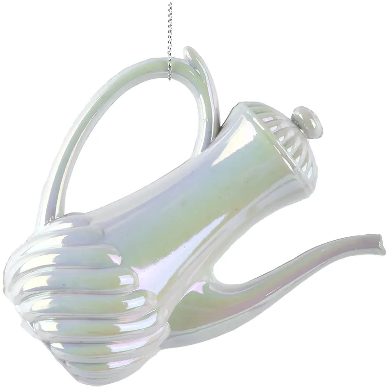 Elegancka i nietuzinkowa ozdoba choinkowa, która zachwyca subtelnością i oryginalną formą. Do wyboru masz dwa wyjątkowe kształty: imbryk lub dzbanek, każdy z nich pokryty delikatnie perłowym połyskiem, który mieni się w świetle lampek, tworząc efekt luksusowego blasku. Ich zimowobiały/irysowy odcień doskonale komponuje się z innymi dekoracjami świątecznymi, dodając aranżacji klasy i stylu. To dekoracja, która idealnie pasuje do stylu glamour, vintage lub klasycznego. Zawieszona na cienkiej nitce, wydaje się lekko unosić w powietrzu, tworząc wrażenie lekkości i finezji.