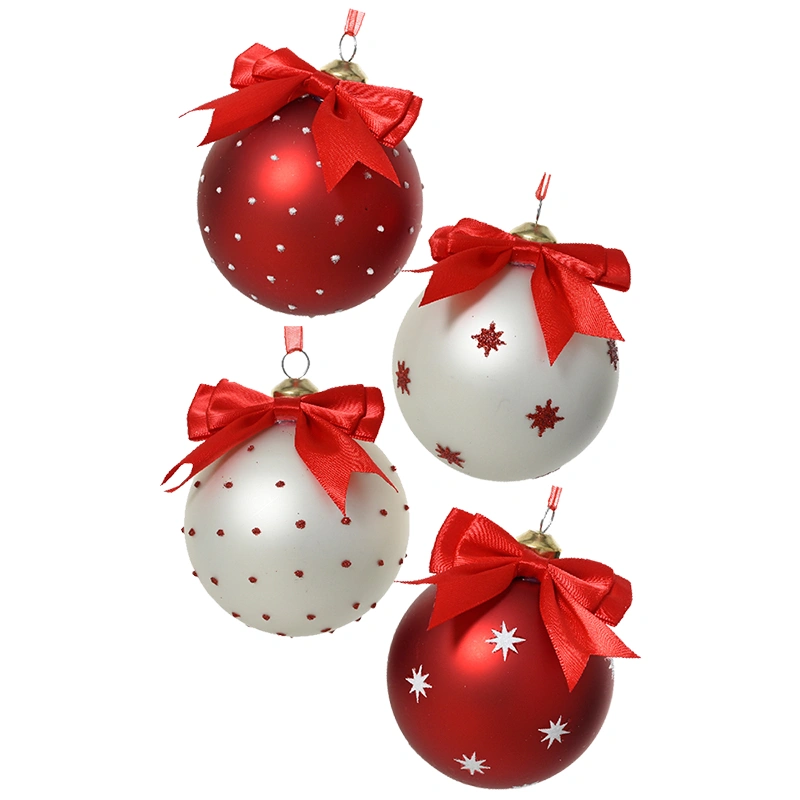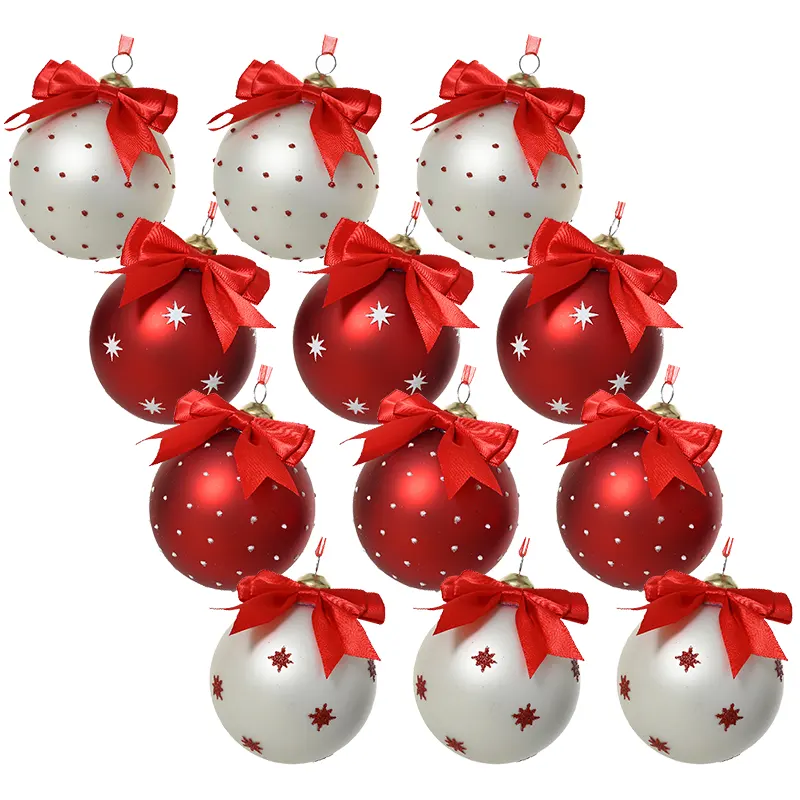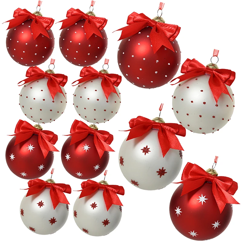 Wyjątkowy komplet 12 szklanych bombek choinkowych o średnicy 8 cm, ozdobionych uroczą czerwoną kokardką na górze. Każda bombka ma unikalny wzór inspirowany Bożym Narodzeniem i zimą, dzięki czemu zestaw jest zróżnicowany i efektowny. Kolorystyka łączy klasyczną czerwień i elegancką biel, zdobioną gwiazdkami lub kropkami. Bombki posiadają metalową złotą nasadkę oraz czerwoną wstążkę z organzy do zawieszania.