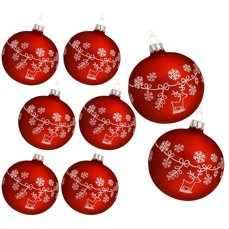 Czerwone szklane bombki z śniegiem i reniferem – zestaw 6 sztuk, 8 cm