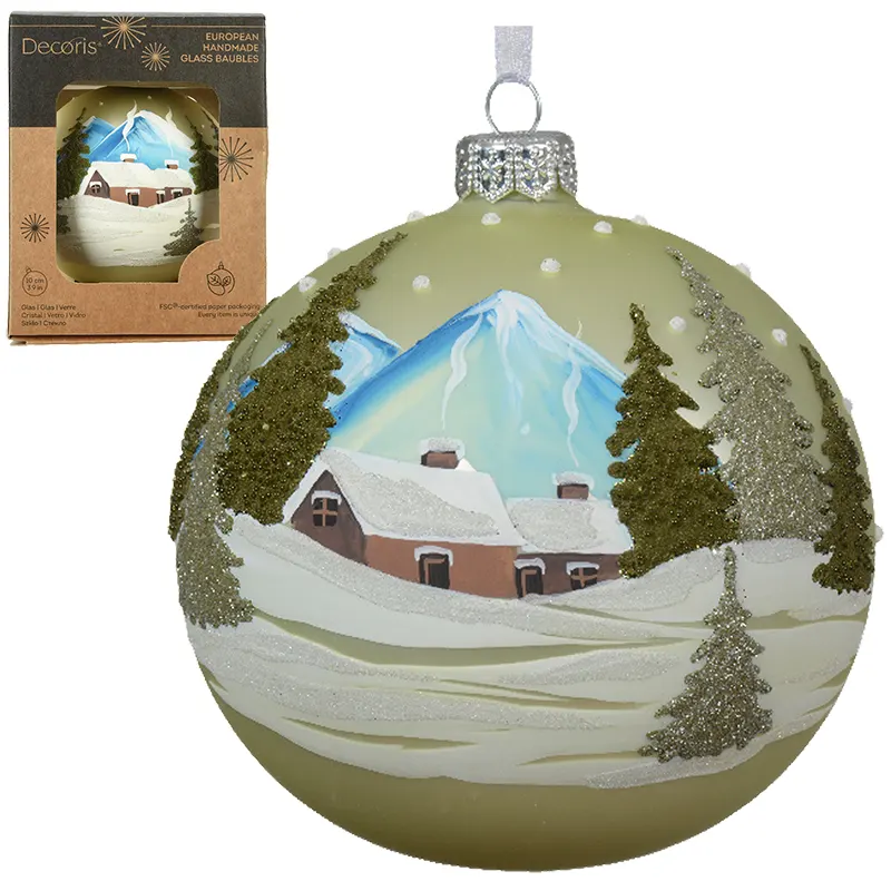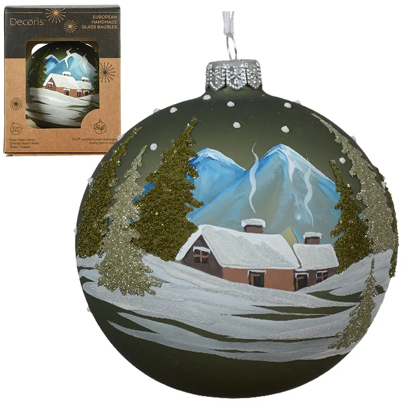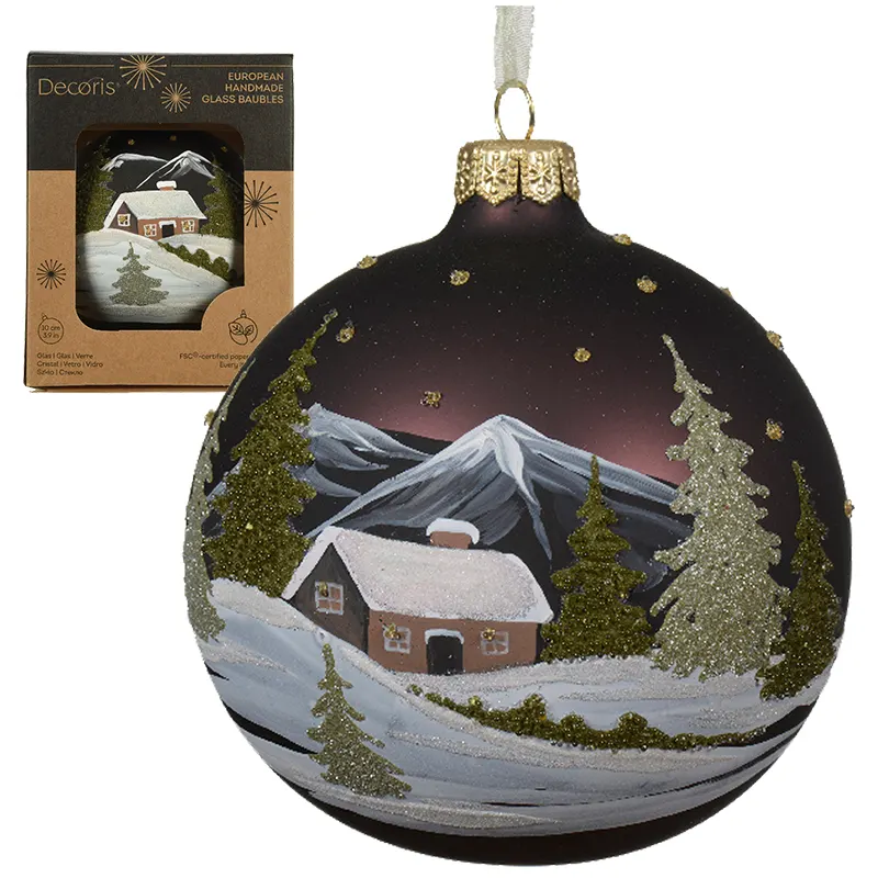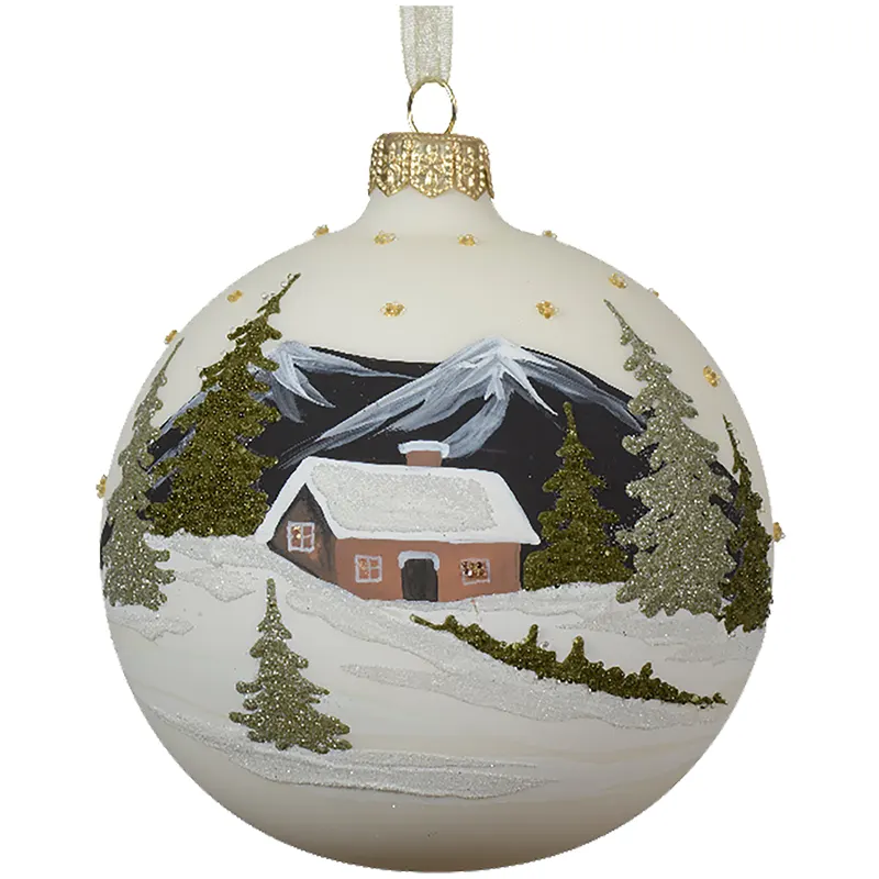 Szklana bombka 10 cm – matowa z motywem domku w górach