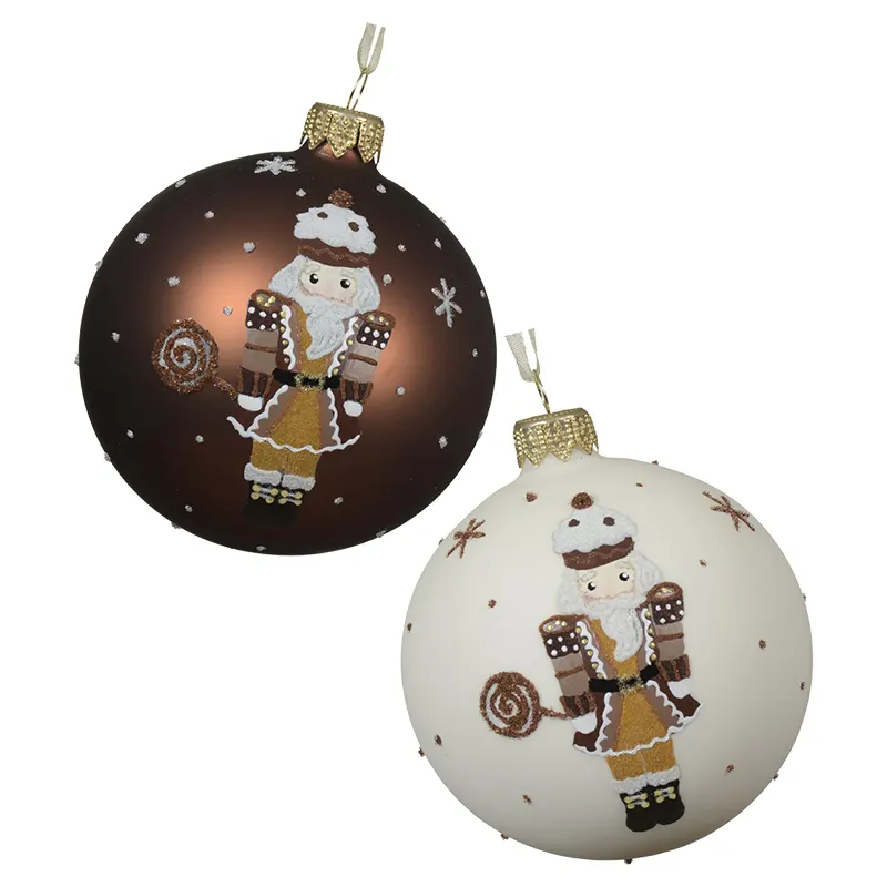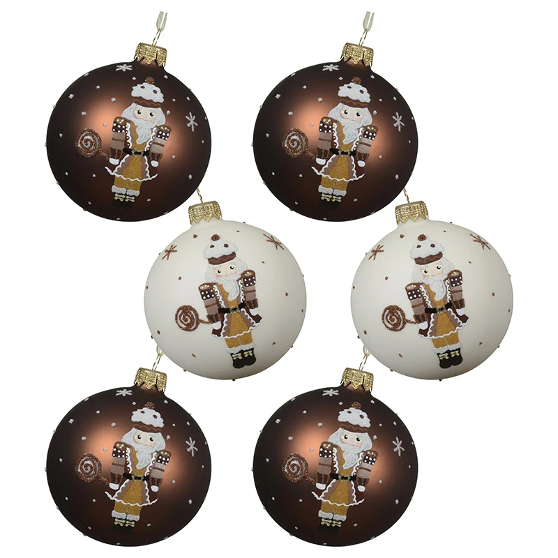 Zachwyć się urokiem tradycji w nowoczesnym wydaniu dzięki zestawowi szklanych bombek choinkowych o średnicy 8 cm z motywem Dziadka do Orzechów. Każda bombka została starannie zdmuchnięta ustami i wykończona matową powierzchnią, która nadaje jej elegancki i subtelny charakter. Na środku każdej bombki widnieje przepięknie zdobiona postać orzechówki – w ciepłych, piernikowych barwach, z połyskującymi detalami, które tworzą przytulną atmosferę świąt.