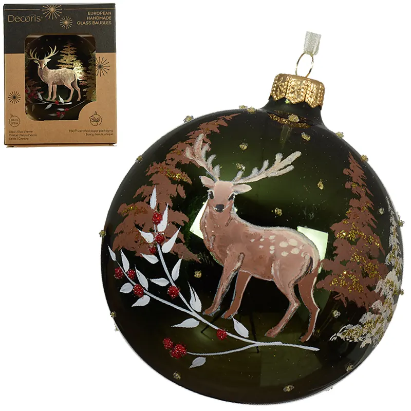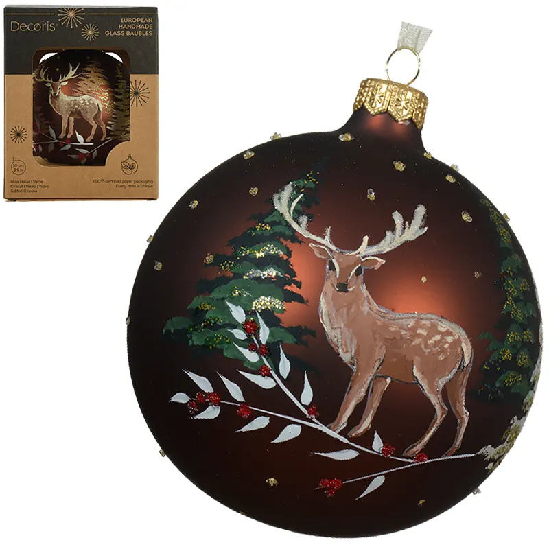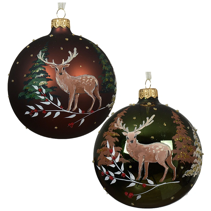 Szklana bombka 10 cm z motywem jelenia – matowa espresso i sosnowa zieleń połysk