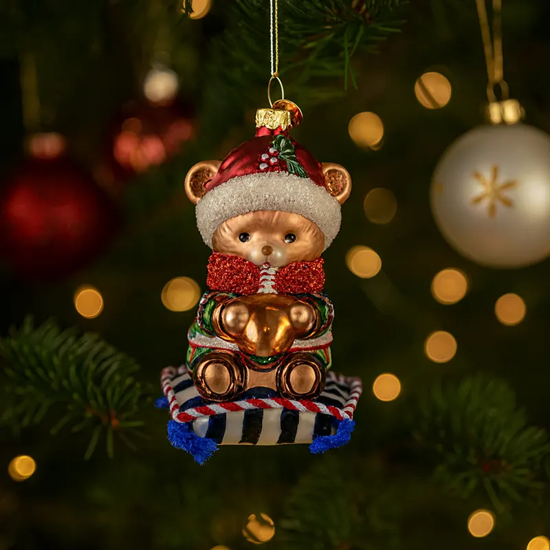 Każdy miś wyposażony jest w złotą metalową czapeczkę oraz wieszak ze złotego drutu zakończony metalową etykietą, dzięki czemu zawieszenie ich na choince jest nie tylko proste, ale i niezwykle efektowne. Te bombki to nie tylko świąteczna dekoracja, ale też miniaturowa historia zamknięta w szkle – pełna ciepła, emocji i dziecięcej radości.