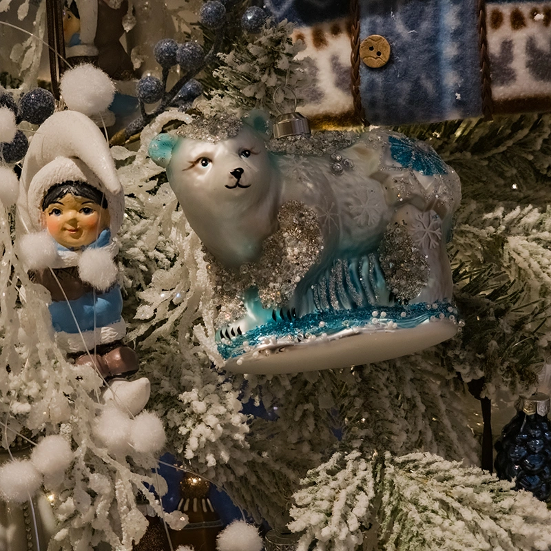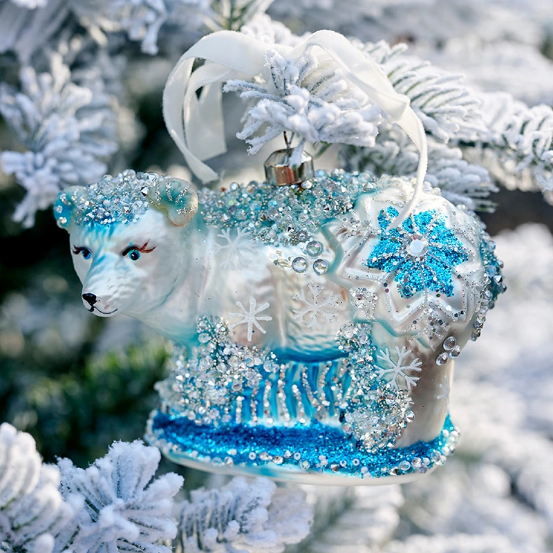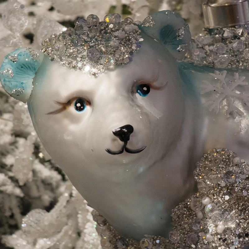 Wyjątkowa, ręcznie zdobiona bombka w kształcie niedźwiedzia polarnego to prawdziwa perełka wśród świątecznych ozdób. Wykonana ze szkła najwyższej jakości i pokryta błyszczącym brokatem, kryształkami i śnieżynkami, przenosi wprost do mroźnej krainy lodu i zimowej magii. Jej bajkowy wygląd przyciąga wzrok, a precyzja detali i efektowna kolorystyka – z przewagą bieli, błękitu i srebra – dodaje jej elegancji i uroku.
