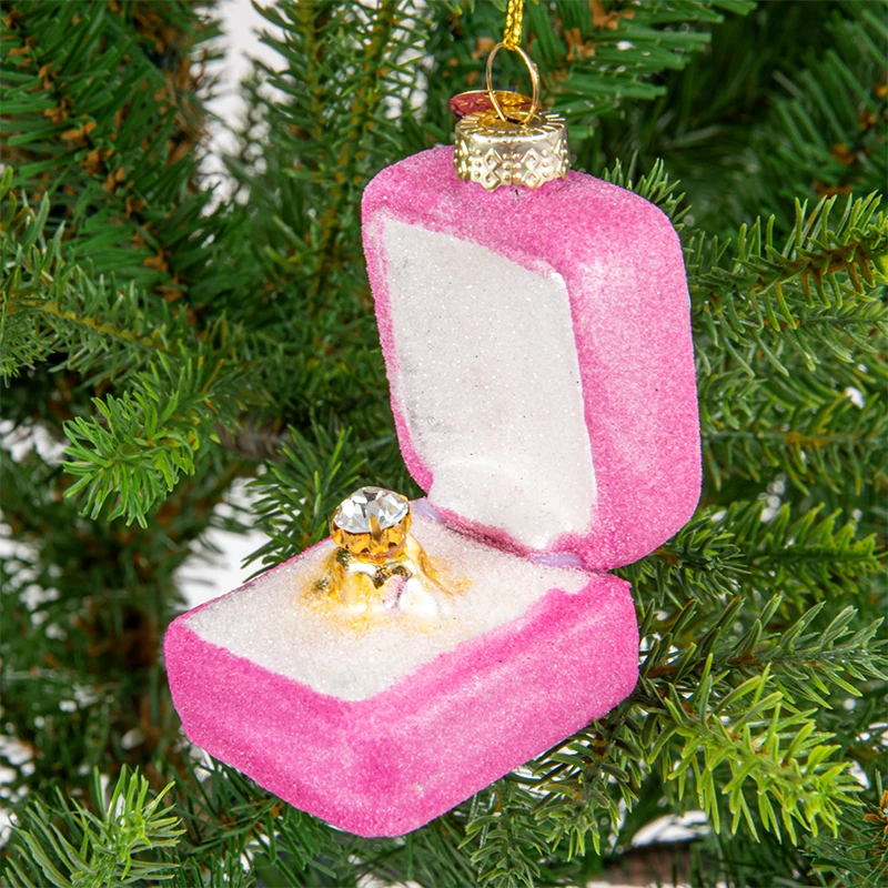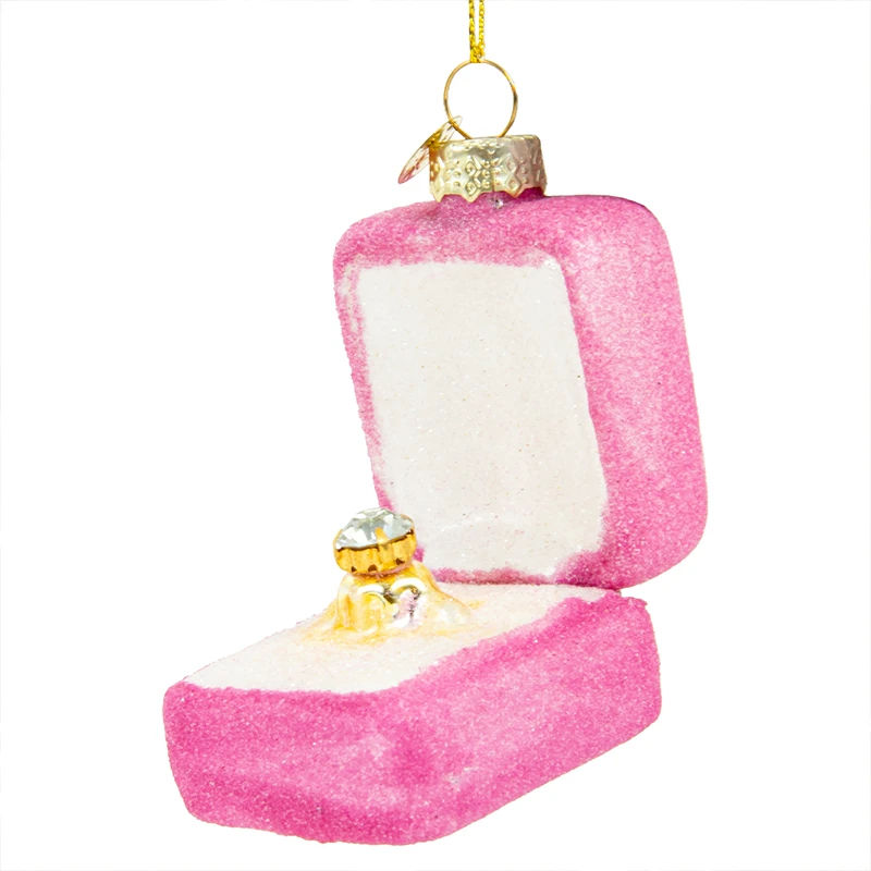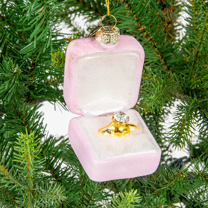 Oto szklana bombka choinkowa w kształcie otwartego pudełeczka z pierścionkiem zaręczynowym. To nie tylko dekoracja, ale także symbol miłości i zaangażowania.