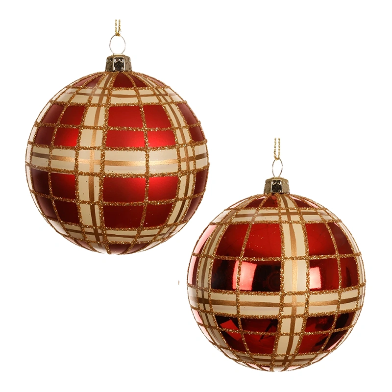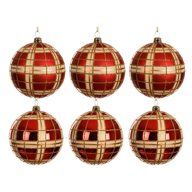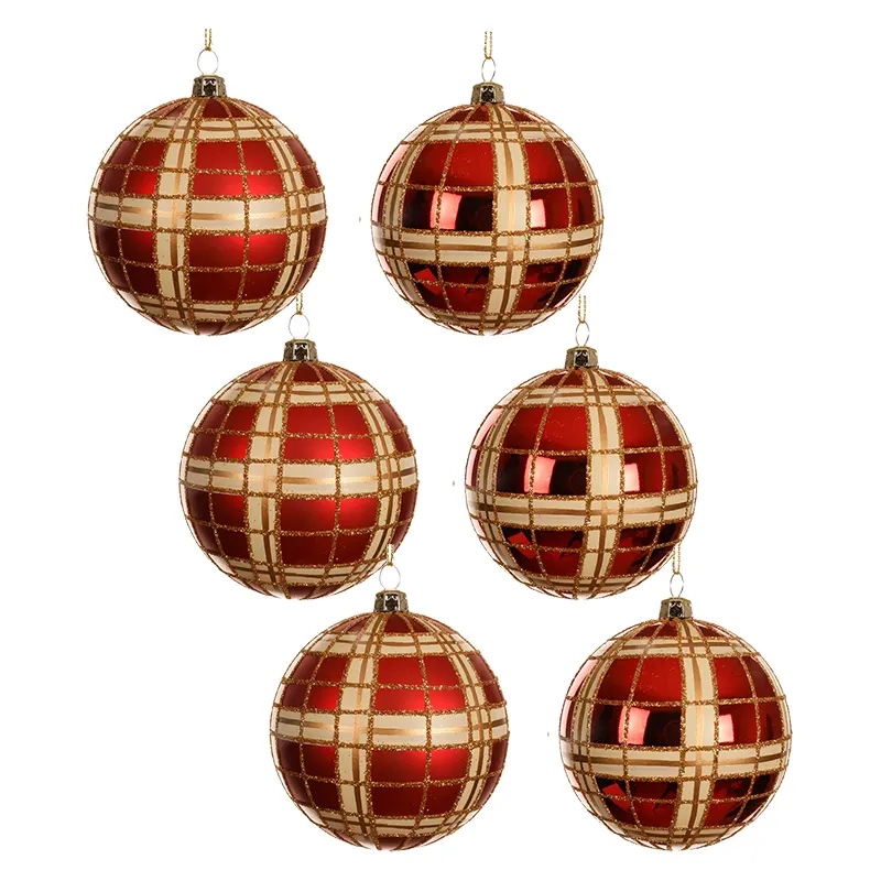 Zestaw bombek plastikowych 8 cm – czerwono-złote w kratę, komplet 6 sztuk