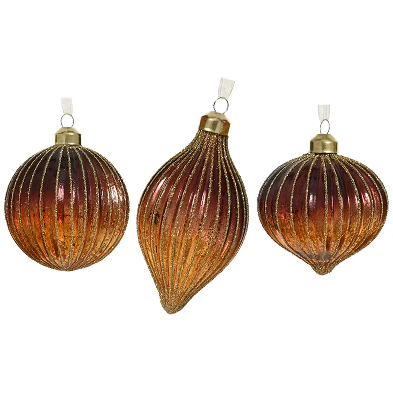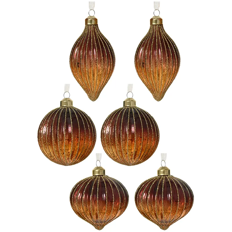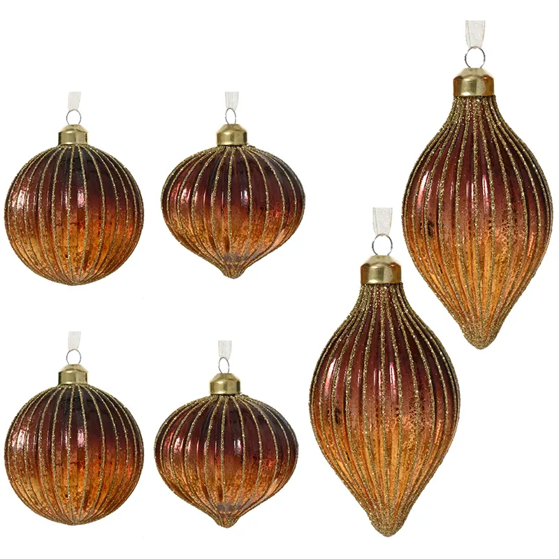 Elegancki komplet 6 szklanych bombek choinkowych, który doda Twojej choince wyjątkowego blasku i wyrafinowanego stylu. Bombki zostały wykonane ze szkła z efektem srebrzenia wewnątrz, dzięki czemu pięknie odbijają światło. Ich powierzchnię zdobią delikatne brokatowe linie, podkreślające pionowe żłobienia i nadające całości luksusowego charakteru. Każda bombka posiada metalową nasadkę w kolorze złota oraz elegancki szampanowy sznureczek z organzy, co sprawia, że dekoracje są od razu gotowe do zawieszenia. Dzięki różnorodnym kształtom zestaw prezentuje się niezwykle efektownie i urozmaica choinkową aranżację.
