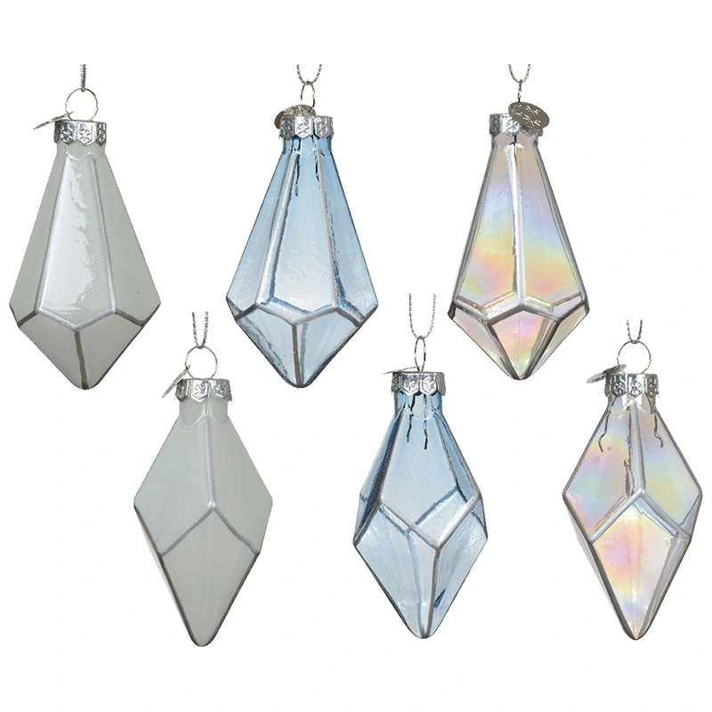 Dodaj elegancji swojej choince z zestawem szklanych bombek o geometrycznym kształcie diamentów. Te bombki zachwycają subtelnymi odcieniami błękitu, perłowym połyskiem oraz delikatnymi, opalizującymi refleksami, które pięknie odbijają światło i wprowadzają nowoczesny styl do świątecznej dekoracji.