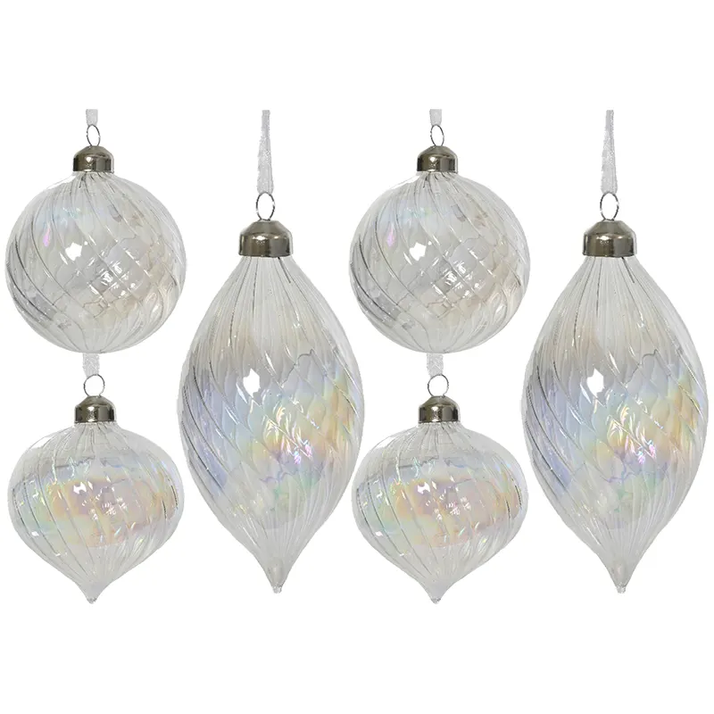 Wprowadź do swojego wnętrza nutę luksusu i subtelnej elegancji dzięki wyjątkowym szklanym bombkom choinkowym o średnicy 8 cm. Ich transparentna powierzchnia została wykończona opalo-perłowym efektem iris, który pięknie mieni się w świetle choinkowych lampek. Każda bombka zachwyca delikatnie skręconym wzorem „swirl”, nadającym jej finezyjnej głębi i wyjątkowego charakteru.