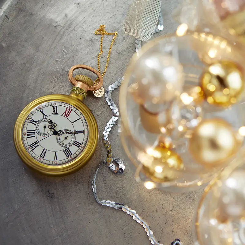 Bombka posiada złoty łańcuszek, który dodaje jej elegancji i umożliwia łatwe zawieszenie. Wykończenie w kolorze połyskującego brązu i złota oraz precyzyjnie odwzorowane detale tarczy zegarka nadają jej wyjątkowego stylu.