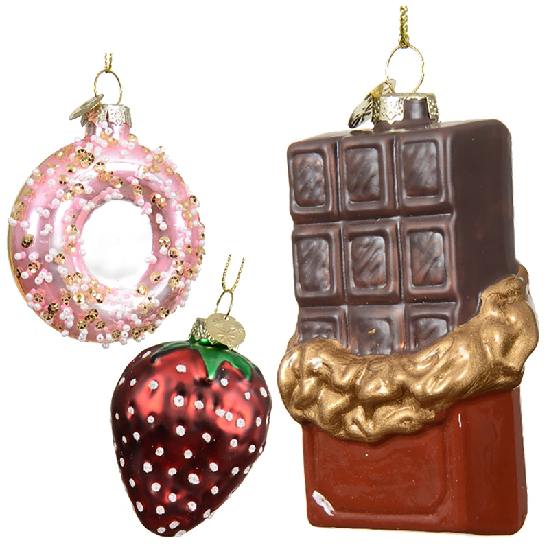 Zestaw szklanych bombek słodycze – pączek, tabliczka czekolady i truskawka z brokatowym wykończeniem