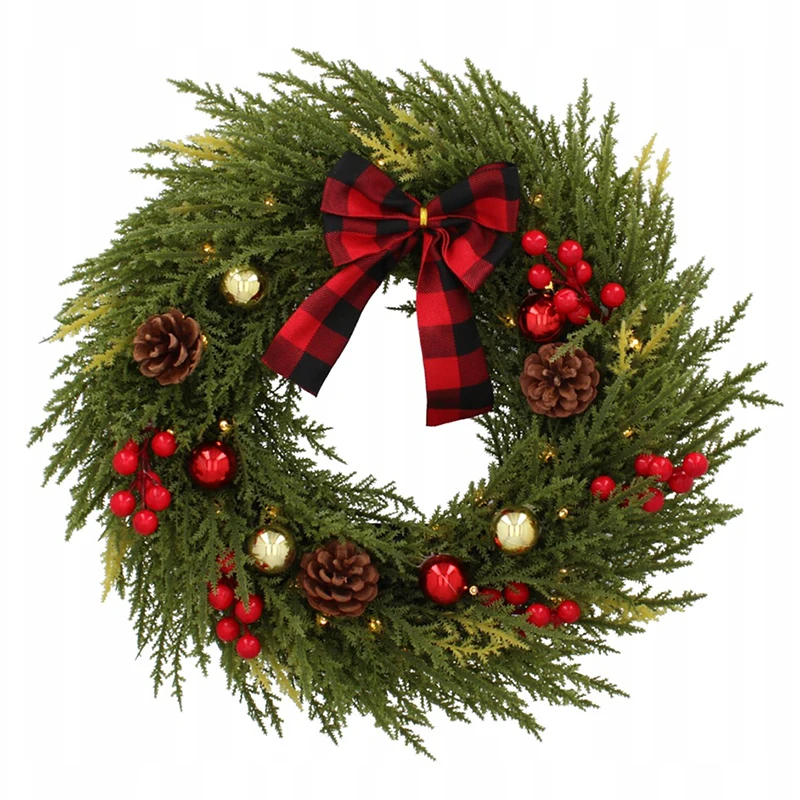 Wprowadź magię świąt do swojego domu dzięki temu pięknemu świątecznemu wieńcowi o średnicy 40 cm, ozdobionemu subtelnymi światełkami LED. Klasyczny, zielony wieniec wykonany z gęstego igliwia został wzbogacony o tradycyjne elementy świąteczne, takie jak szyszki, czerwone i złote bombki, a także jagody, które dodają mu uroku i elegancji. Całość wieńczy duża, kraciasta kokarda w stylu rustykalnym, która przyciąga wzrok i podkreśla świąteczny charakter dekoracji.
