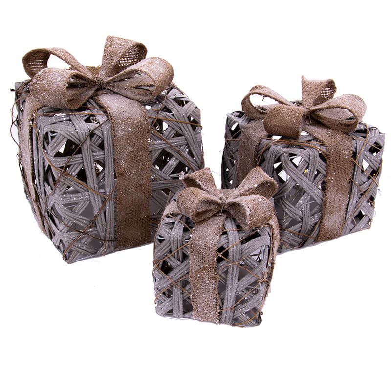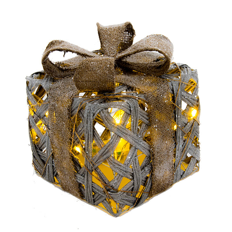 Dekoracja świąteczna LED w formie ozdobnych pudełek na prezenty. Pudełka wykonane z drutu oplecione sznurkiem w kolorze złota z lampkami LED. Duża ozdobiona kokarda z juty oprószona sztucznym śniegiem wnosi nutę romantyzmu.