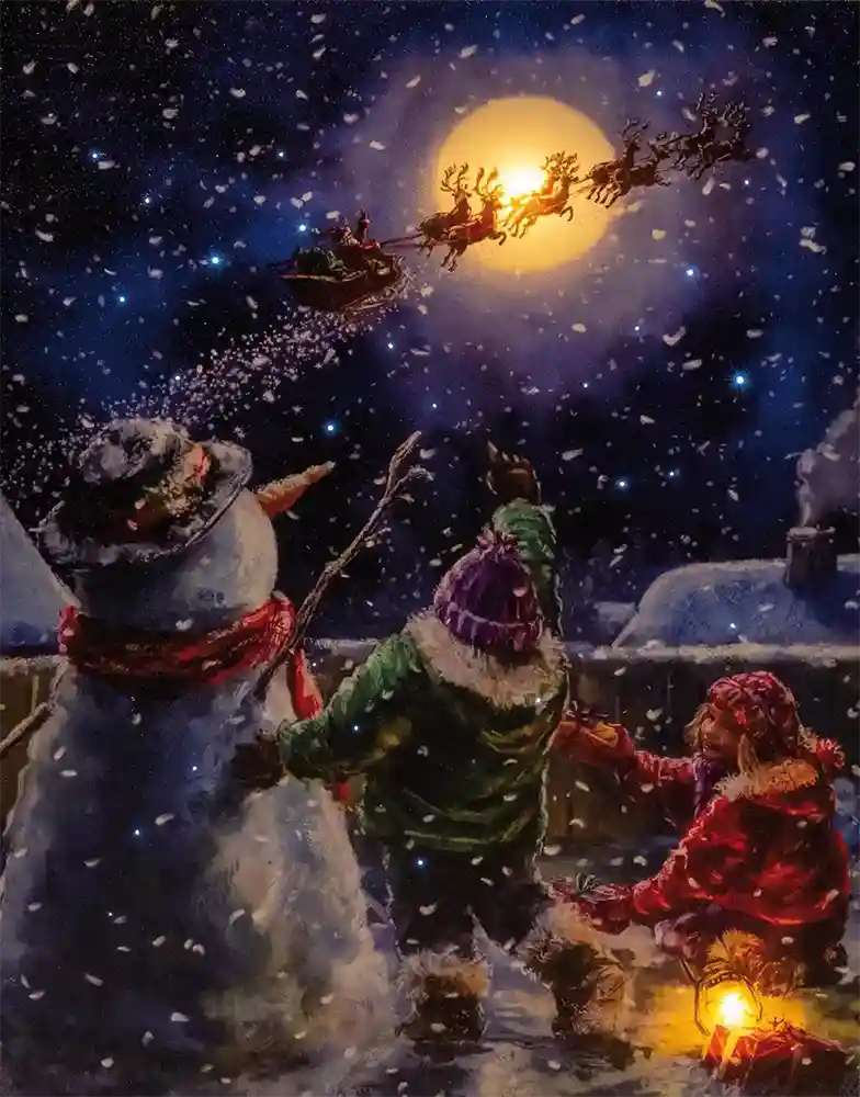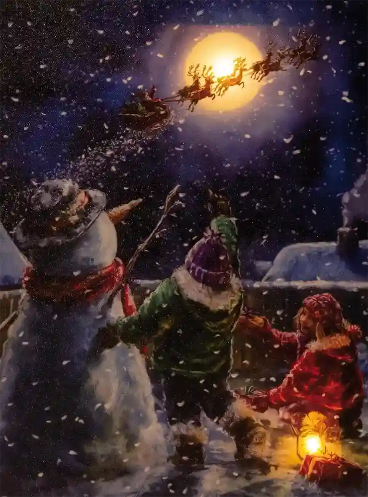 Wyjątkowy obraz przedstawiający bałwana na tle pełni księżyca.