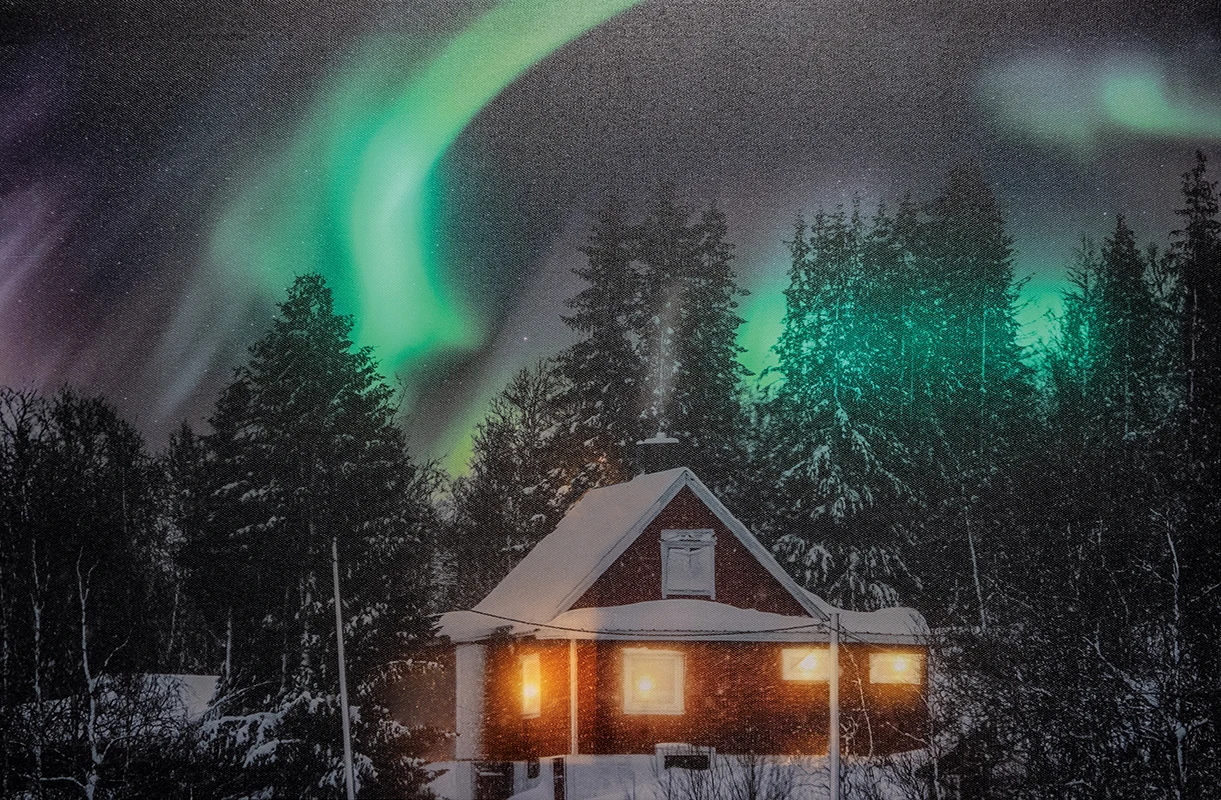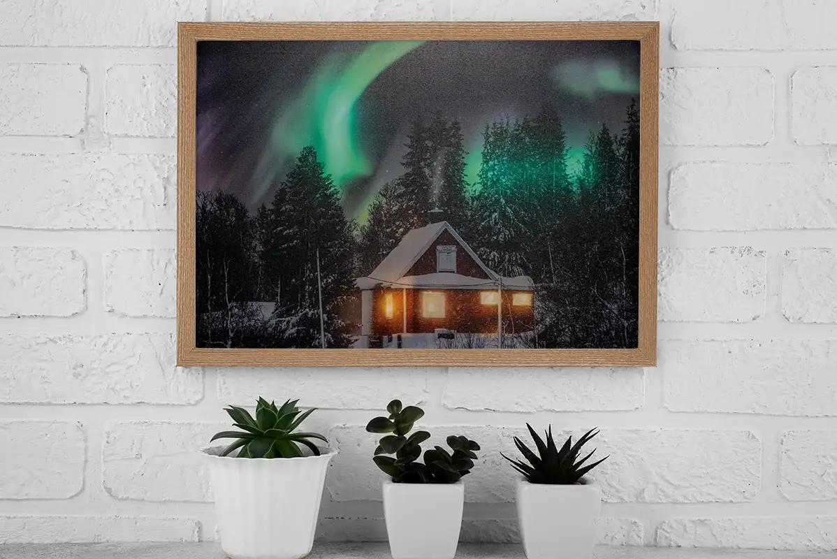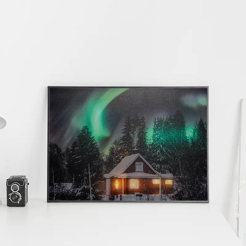 Podświetlane okna domku dodają scenie ciepła, kontrastując z chłodnym blaskiem zorzy, co sprawia, że obraz przyciąga uwagę i staje się centralnym punktem dekoracji w każdym wnętrzu. Zasilany na 2 baterie AA, obraz jest nie tylko łatwy w obsłudze, ale też można go umieścić w dowolnym miejscu, bez potrzeby korzystania z gniazdek.