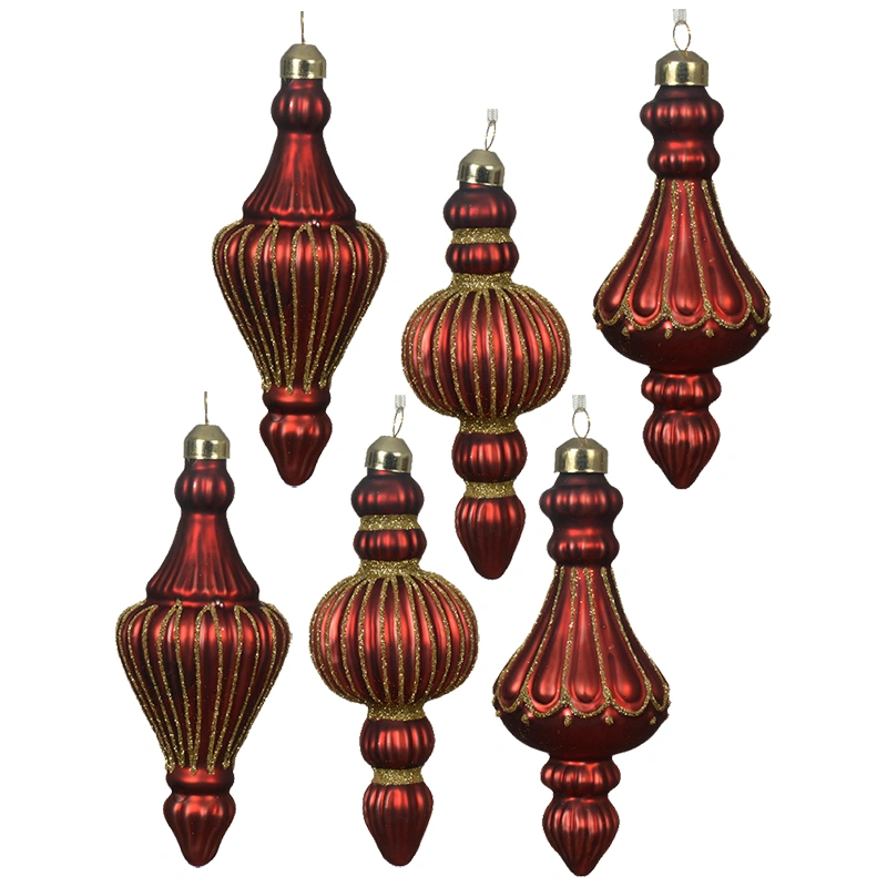 Dodaj swojej choince wyjątkowego charakteru dzięki zestawowi szklanych bombek choinkowych w kształcie ornamentów. Każda z nich ma wysokość 16 cm i średnicę 6 cm, dzięki czemu pięknie wyróżnia się na tle gałązek. Wykonane z wysokiej jakości szkła w matowym wykończeniu, zdobione są eleganckimi złotymi liniami brokatowymi, które subtelnie połyskują w blasku lampek choinkowych.