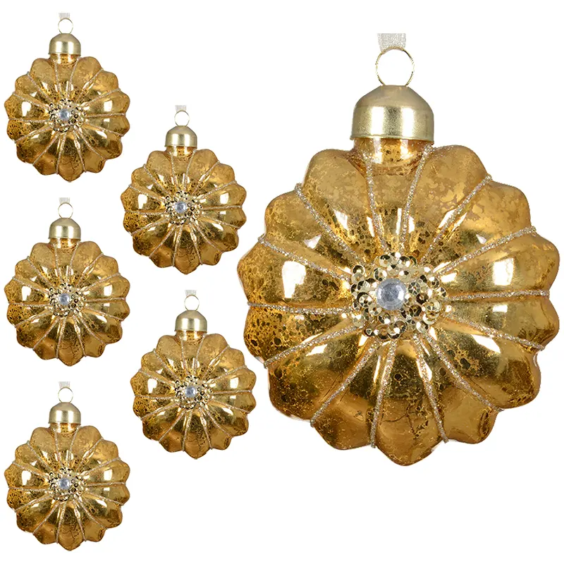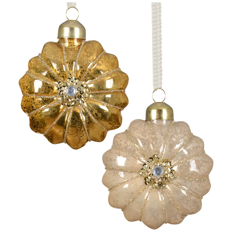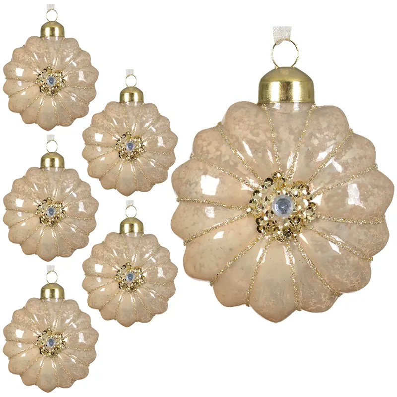 Szklane bombki w kształcie rozety z brokatem i klejnotami – złoto i perła w dekoracyjnej odsłonie