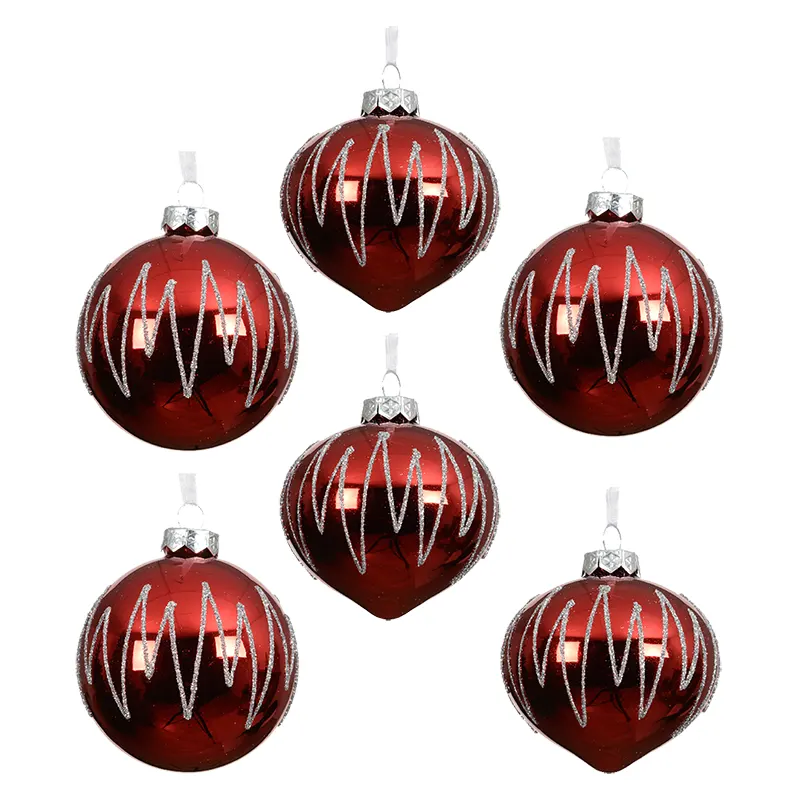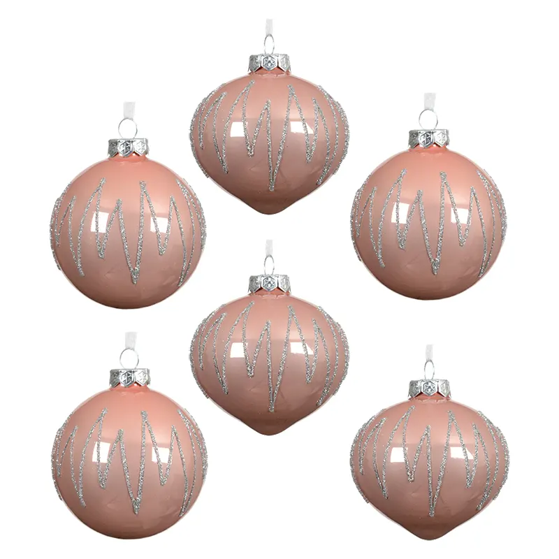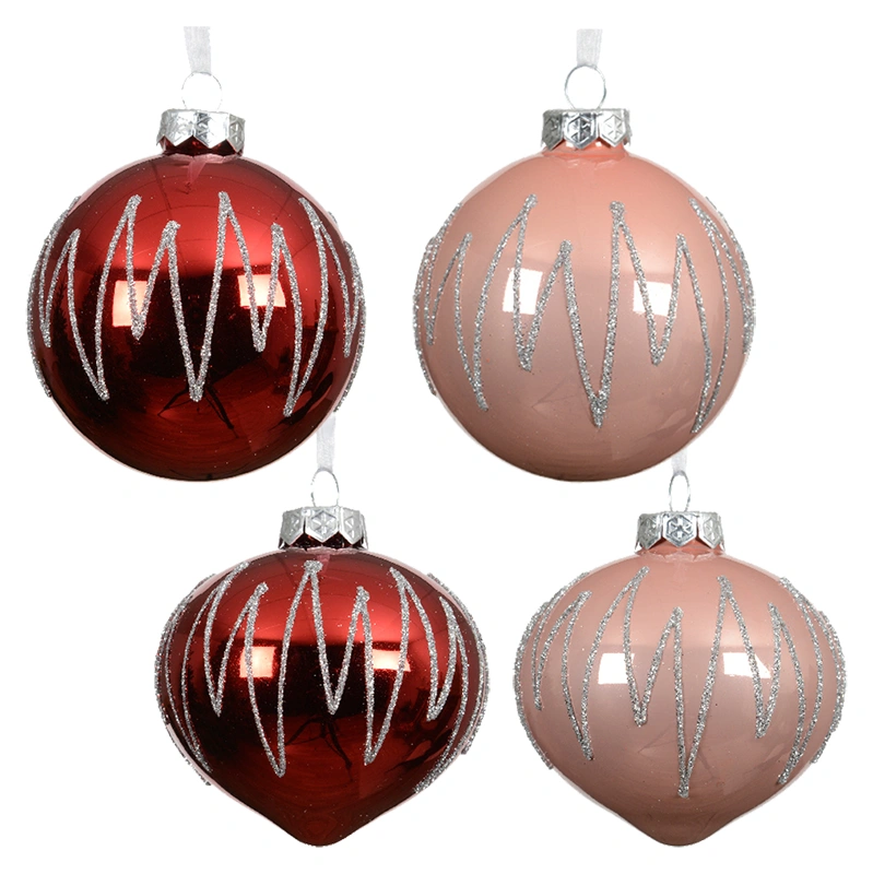 Dodaj swojej choince wyjątkowego blasku i stylu dzięki zestawowi szklanych bombek choinkowych o średnicy 8 cm. W komplecie znajduje się aż 6 sztuk eleganckich bombek w dwóch wariantach kolorystycznych: głęboka, świąteczna czerwień oraz delikatny, pudrowy róż. Każda z nich zdobiona jest srebrnym brokatowym wzorem, który pięknie odbija światło i nadaje dekoracjom wyjątkowego charakteru.