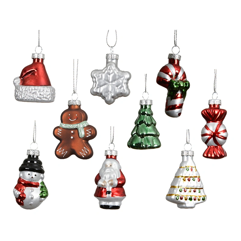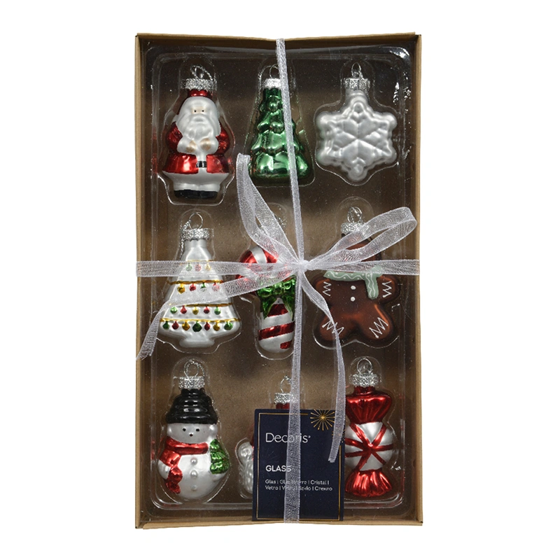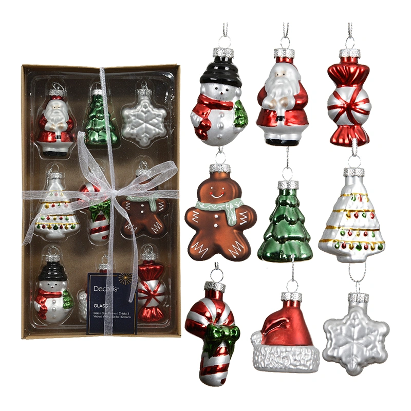ŚWIĄTECZNE SZKLANE FIGURKI Z WSTĄŻKĄ - ZESTAW 9 SZTUK
