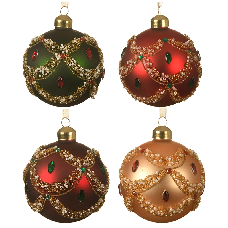 Wprowadź do swojego domu odrobinę świątecznego przepychu i klasycznego uroku dzięki tym wyjątkowym, szklanym bombkom choinkowym. Każda z nich zachwyca misternym zdobieniem z perełek, brokatu i kryształków, które układają się w elegancki, pałacowy wzór przyciągający wzrok i pięknie odbijający światło lampek choinkowych.