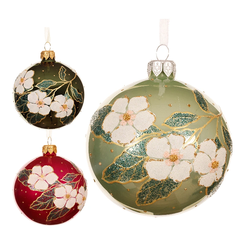 Zestaw szklanych bombek 8 cm – 6 sztuk z kwiatowym wzorem i brokatem