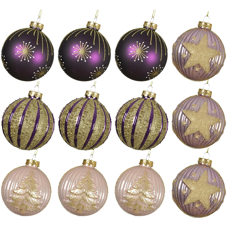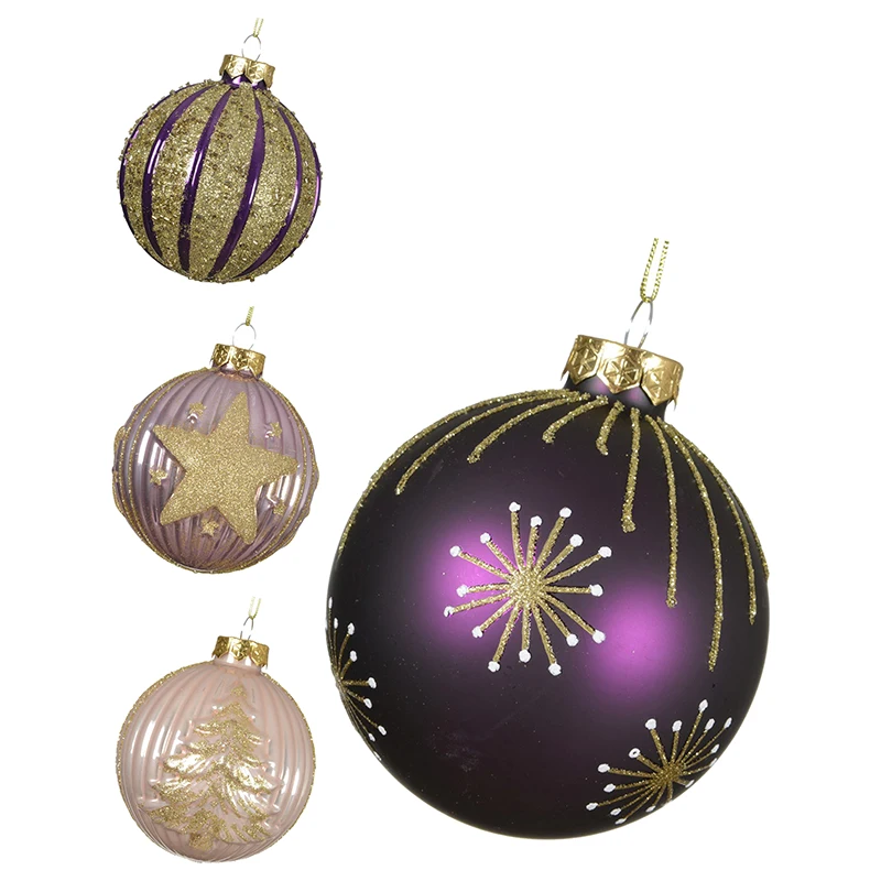 Szklane zestaw figowo-różowych dekorowanych bombek 8 cm kpl. 12 szt.