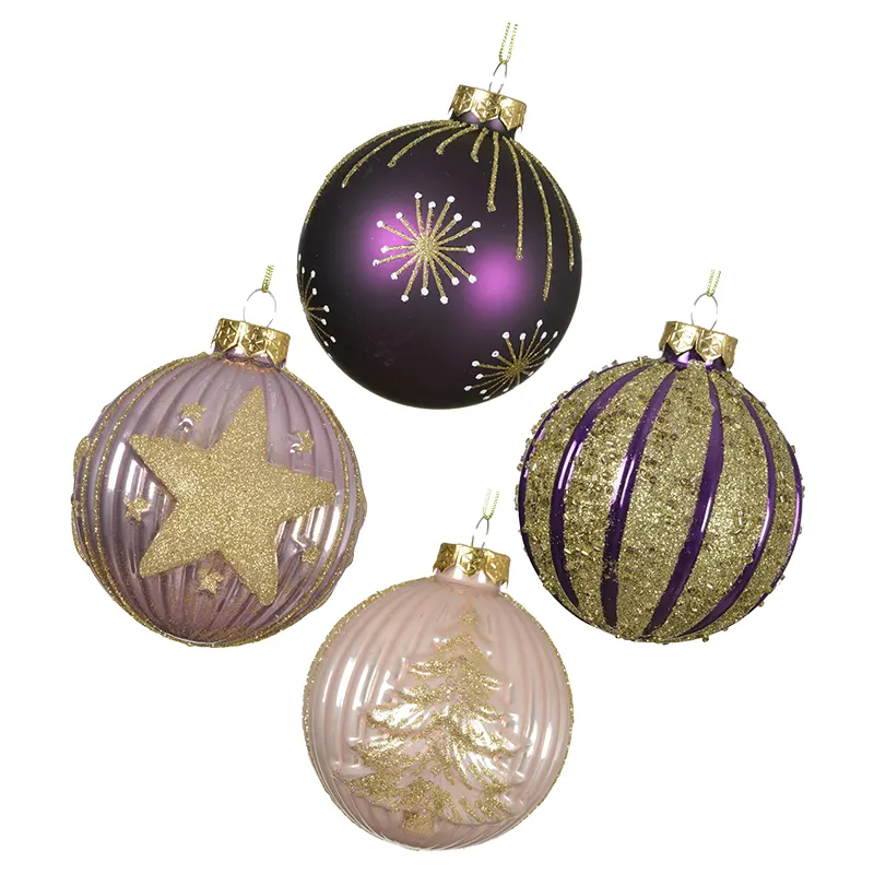 Dominuje tu kolorystyka fioletu, różu i złota, które w połączeniu z brokatowymi zdobieniami tworzą zachwycający efekt wizualny. Szklana forma i emaliowana powierzchnia dodają im klasy i trwałości. Bombki zawieszone są na metalowych wieszakach z złotą czapeczką, co sprawia, że łatwo je przymocować i pięknie prezentują się w świetle choinkowych lampek.