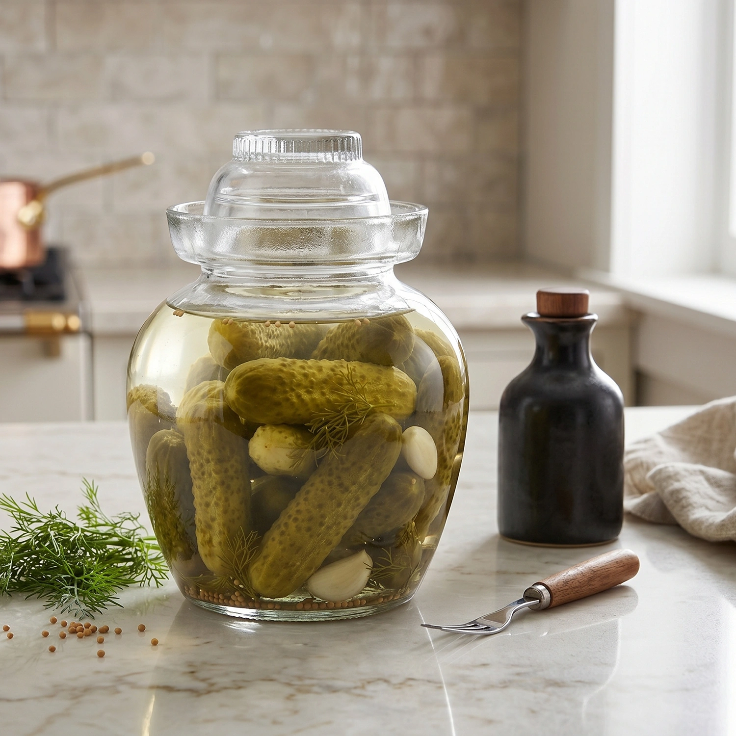 Słój świetnie nadaje się do przechowywania kiszonek, przetworów, produktów sypkich, suszonych owoców oraz innych domowych zapasów, które wymagają uporządkowanego i wygodnego przechowywania.