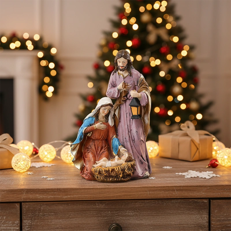 Klasyczna figurka Świętej Rodziny o wysokości 21 cm to wyjątkowy element dekoracyjny, który idealnie dopełni świąteczny wystrój wnętrza. Maria, Józef i Dzieciątko Jezus zostali przedstawieni z wyraźną dbałością o detale – od wyrazów twarzy, po fałdy szat i subtelne złocenia. Postacie tworzą zwartą kompozycję, dzięki czemu figurka jest stabilna i prezentuje się efektownie nawet na niewielkiej powierzchni.