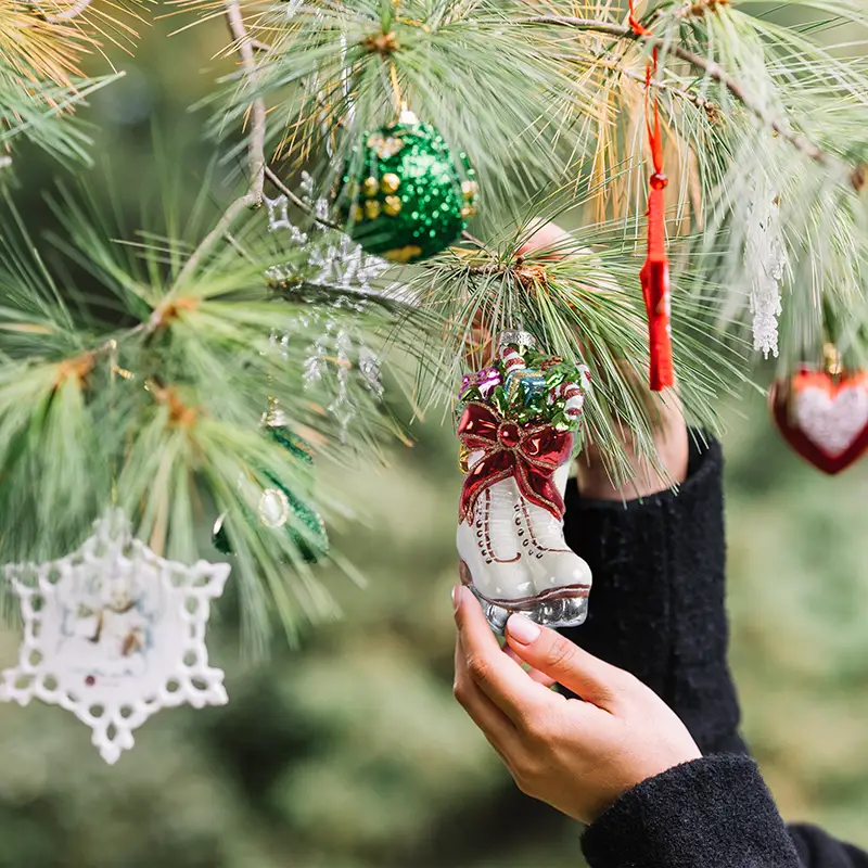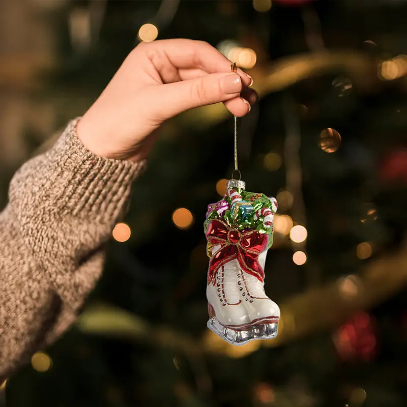 Wprowadź świąteczny nastrój do swojego domu z tą elegancką szklaną bombką w kształcie buta, ozdobioną brokatem, kokardą i kolorowymi świątecznymi elementami. Bombka wykonana z najwyższej jakości szkła, zachwyca swoim detalem i wykończeniem. Jej wielokolorowy design zdominowany przez czerwone, zielone i złote akcenty sprawia, że doskonale komponuje się z klasycznymi świątecznymi dekoracjami.